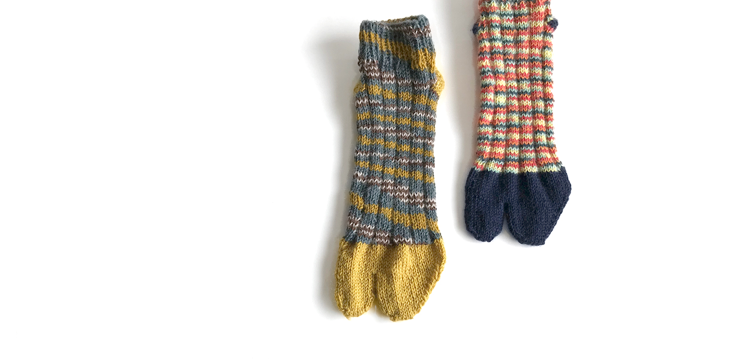 靴下・手袋などの小物ニットに最適な手あみ糸「コロポックル」と、カラフルな「コロポックルマルチカラー」を組み合わせて編んだ足袋ソックスです。