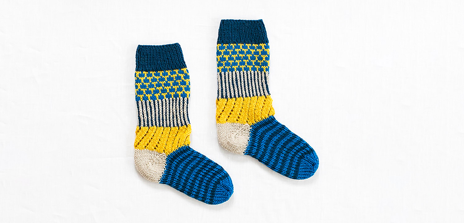 編み込み模様と透かし編みの入ったカラフルなくつ下
