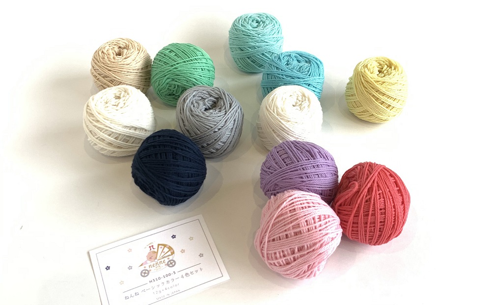 ※セットには上質なベビー糸『ねんね』の小巻4色とそれを使って作る小物作品の編み図がついています。