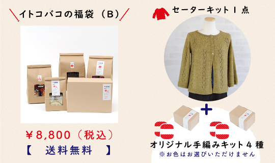 6,000円相当の糸と編み図をイトコバコのオリジナルボックスに入れてお届けする福小箱