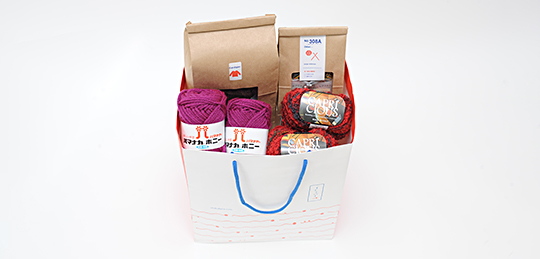 糸と編み図がセットになった編み物キット4点、10,000円相当の商品が入った福袋