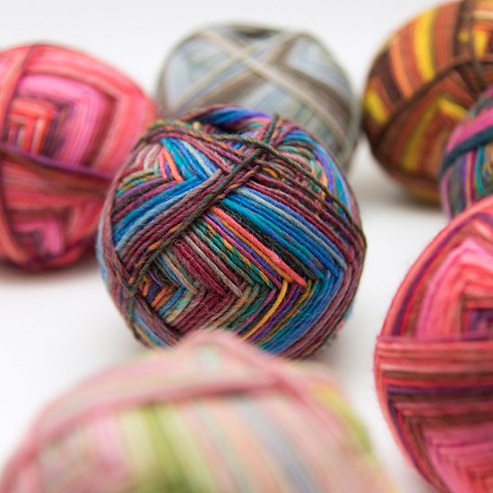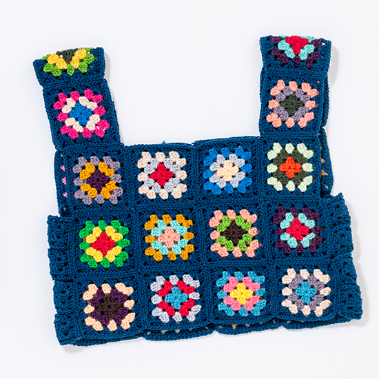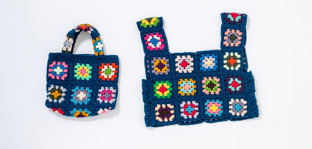 セットには画像の作品からウェアとバッグのセット、もしくはブランケットがつくれる量の材料と編み図が入っており、色の組み合わせをご自身で考えながらつくれる内容となっています。