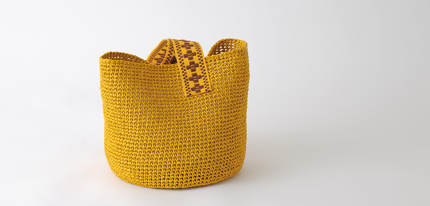 エコアンダリヤで編んでいますが、マスタードカラーで秋口にも持って頂けるデザインです♪