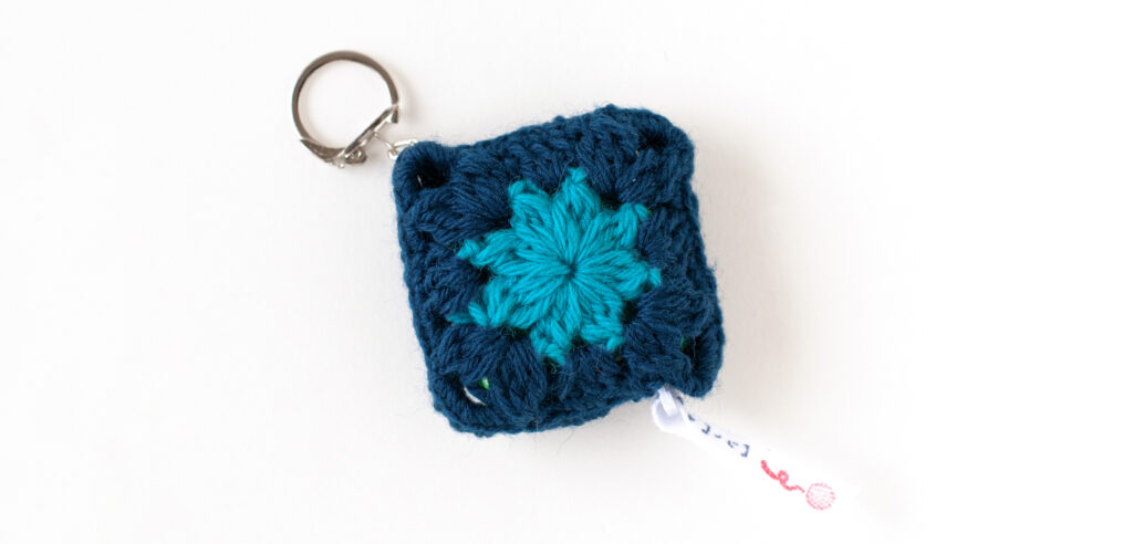 ランダムに入った2色の小巻糸でモチーフ2枚を合わせたかわいいメジャーケースがつくれるキットになっています。