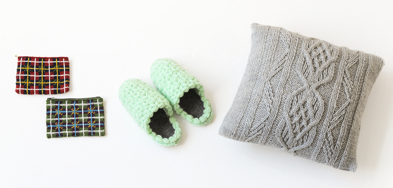 ポーチやクッションカバー、スリッパなど小さな作品から大きな作品まで編みたい雑貨を編んでいただけるワークショップです。
