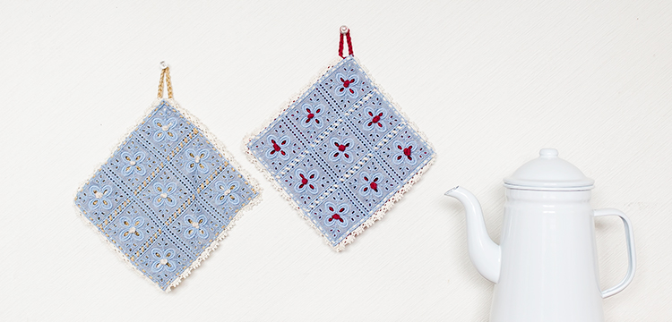 表面はコットンの刺繍レース。2枚をつなぎ合わせて作るので、なべつかみやなべ敷きとしてキッチンで大活躍!!