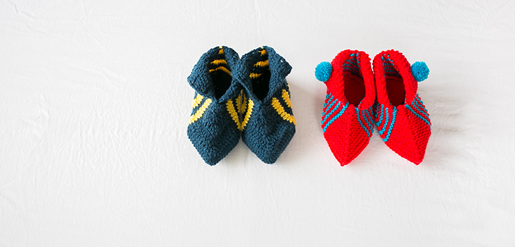 中央で減目しながら四角形に編んでいくドミノ編みでルームシューズを作ります。しましま部分がアクセントになってます。同じような編み方でかぎ針編みバージョンもご用意しました。