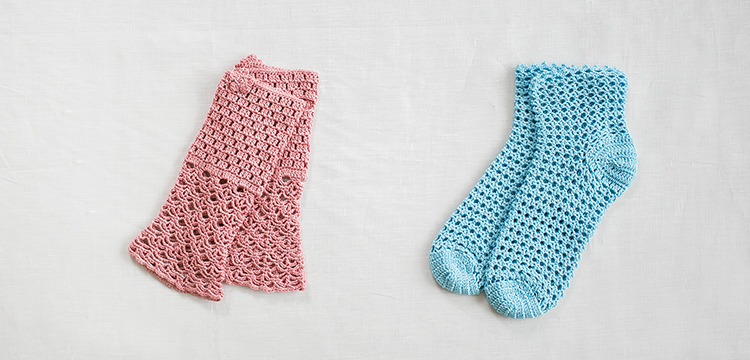 くつ下とアームカバーを肌触りの良いコットンの糸で編みませんか。くつ下は繊細なレース柄、アームカバーは方眼模様とネット模様を組み合わせています。当日はアプリコの26色からお好きな色をお選びいただけます。