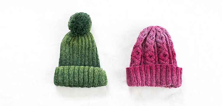 グラデーションの綺麗な「カウニス」という糸で帽子を編みました。アラン模様はなわ編みを基本に編んでいただきます。アラン模様が少し難しいかも…という方には簡単な2目ゴム編み帽子をご用意。最後に大きなボンボンをつけてポイントにします。ベビーアルパカが入った手触りやわらかな糸なので、編み心地、かぶり心地ともに抜群です!