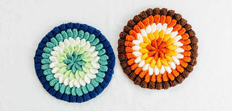 グラデーションの配色が美しいダリアの円座を編みましょう。土台を編んでから花びらを編みつけていきます。花びらの重なりで、ふんわりとした座り心地ですよ。ボニーの中から、お好きな色をお選びいただけます。