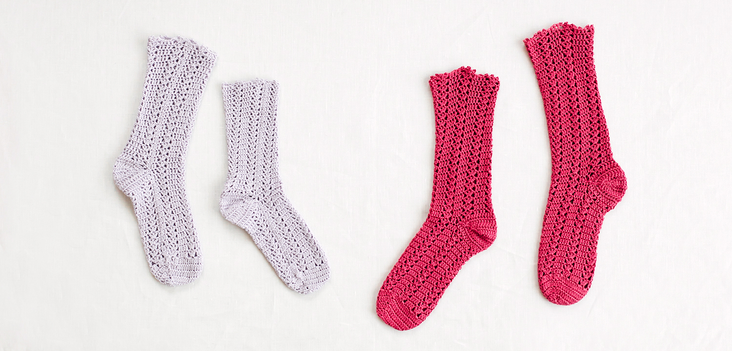 くつしたといえば棒針を思い浮かべますが、レース模様が素敵なかぎ針編みのくつしたも素敵です。当日はアプリコ、27色の豊富な色数からお好きな色をお選びいただけます。スーピマ綿の肌触りが気持ちよいですよ。難易度★☆☆5月25日、28日(土)両日キャンセル待ち受付になります。