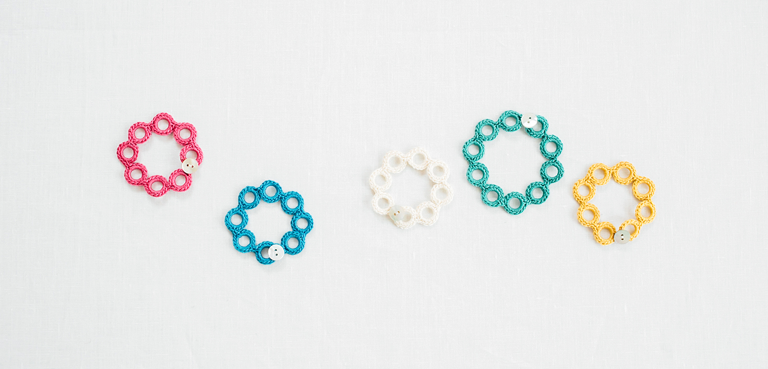 カラフルなコットンの糸でニット用のリングを編みくるみながら編むアクセサリーです。作り目をしなくていいので、初心者さんにもおすすめです。難易度★☆☆