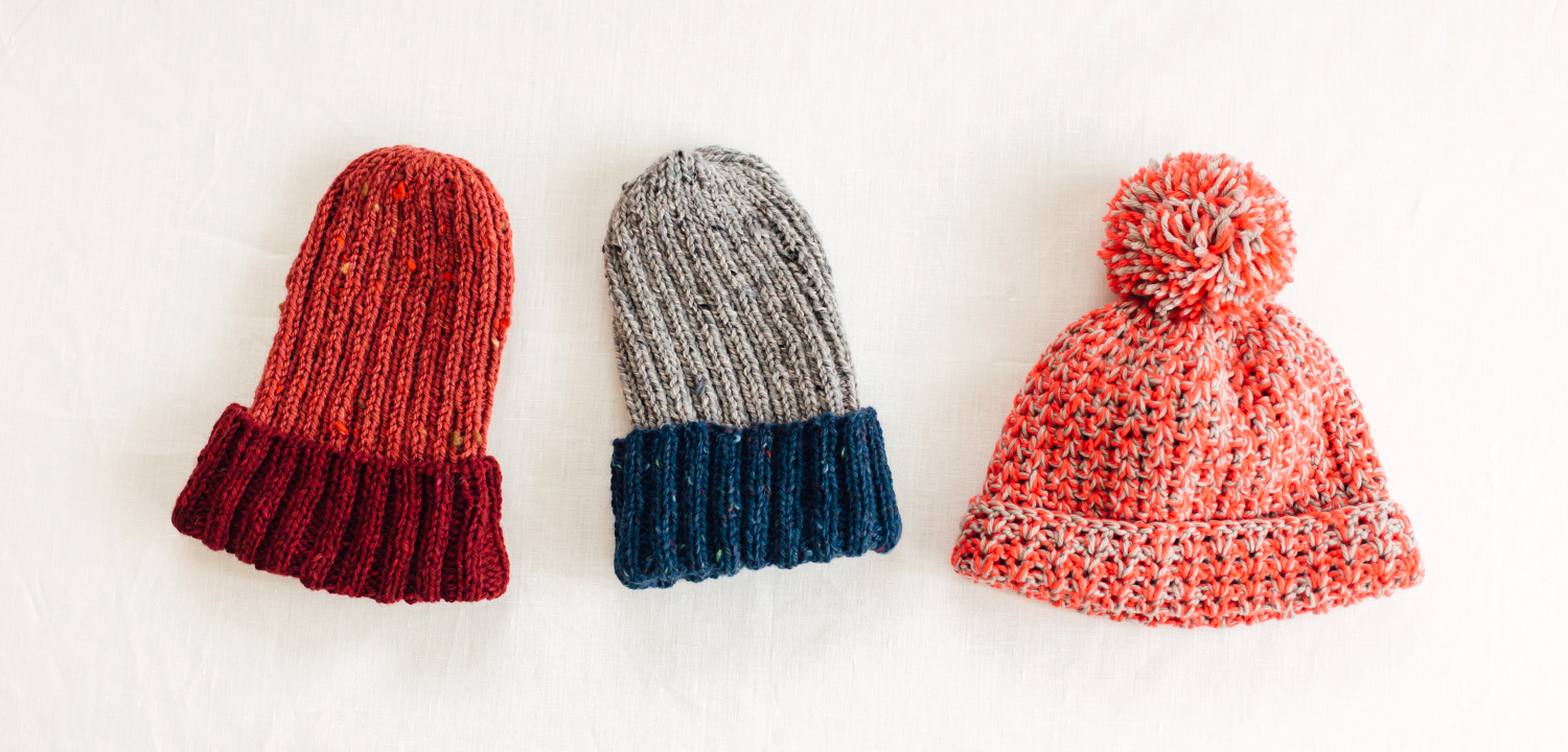 ツィードのニット帽は2目ゴム編みだけで編めます。ボンボン帽子は長編みと鎖編みだけで編めます。※お申込みの際にツィード帽子かボンボン帽子をお選び下さい。