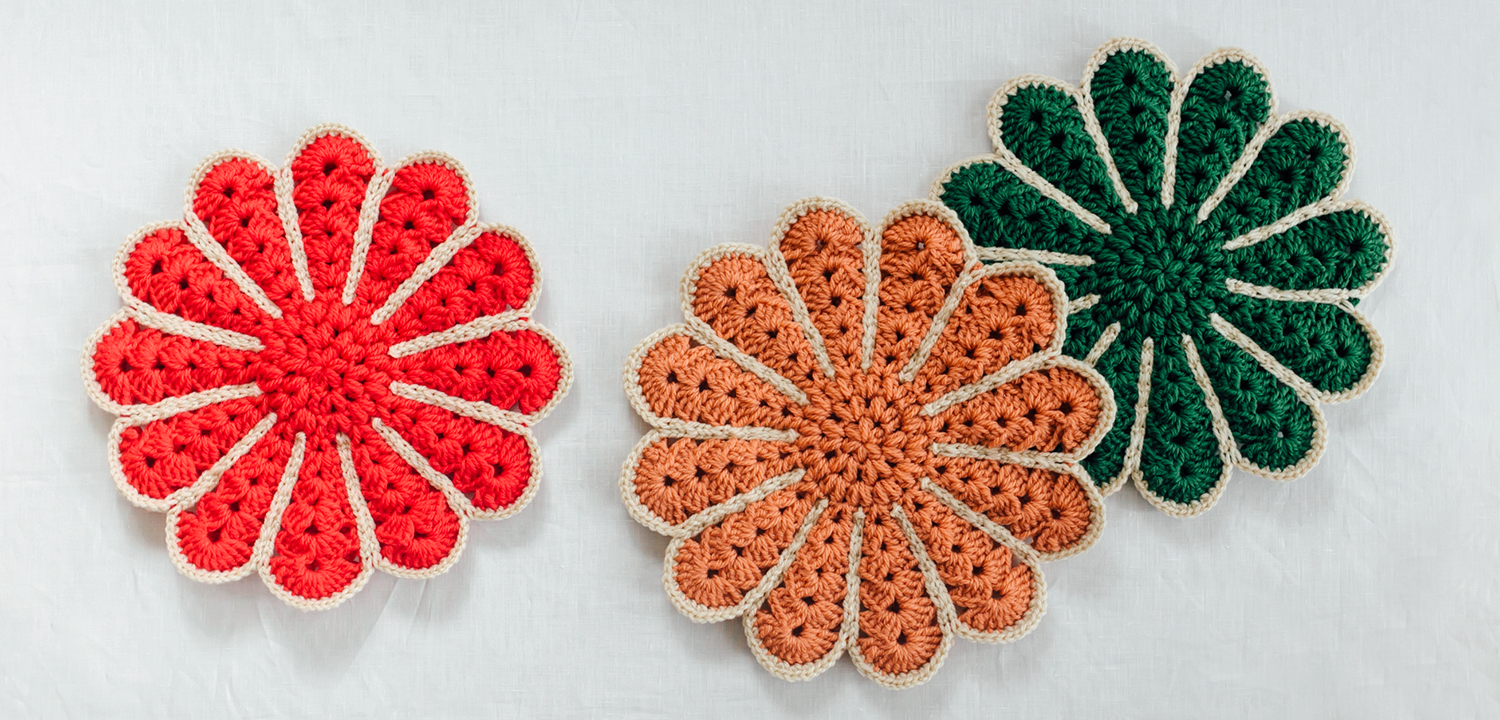 小さめサイズなので、円座がはじめての方にもおすすめです。お花を2枚編んでから引き抜き編みでつなぎ合わせます。