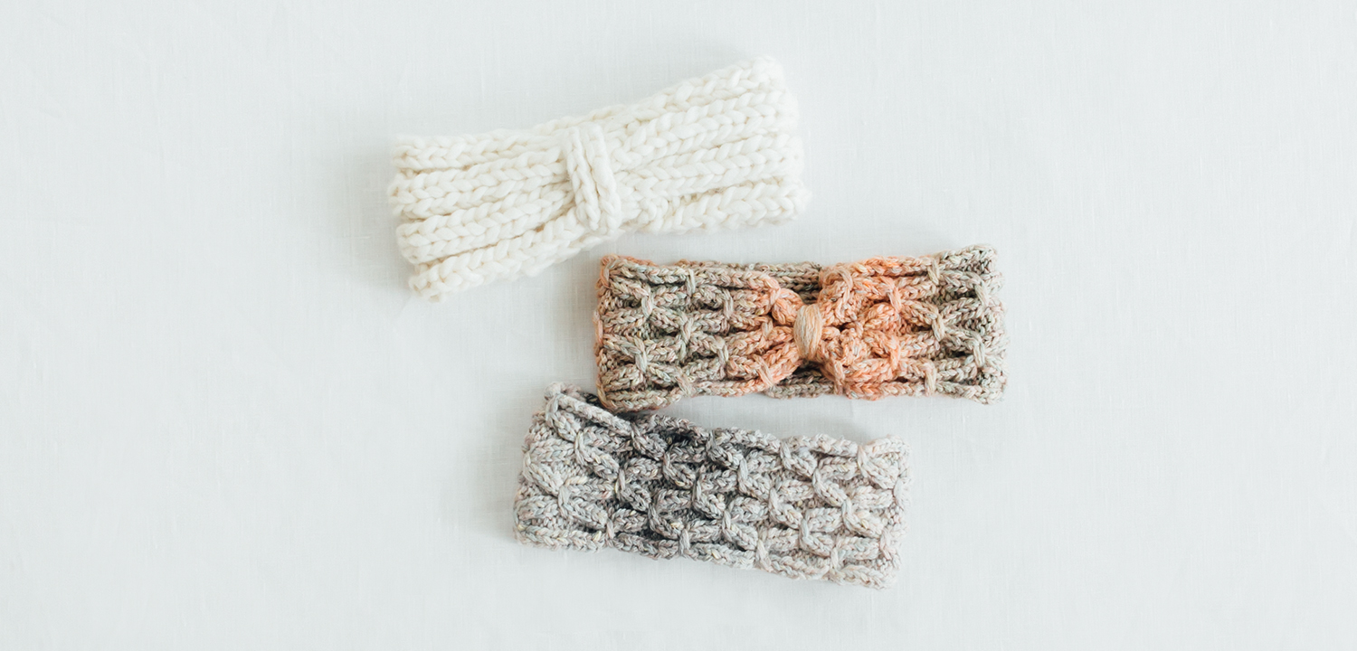 さりげないグラデーションの糸で編むスモッキングのターバン(A・B)と、ロービングヤーンでざっくり編むシンプルなタイプのターバン(C)お好きな方を選んで編んでいただきます。