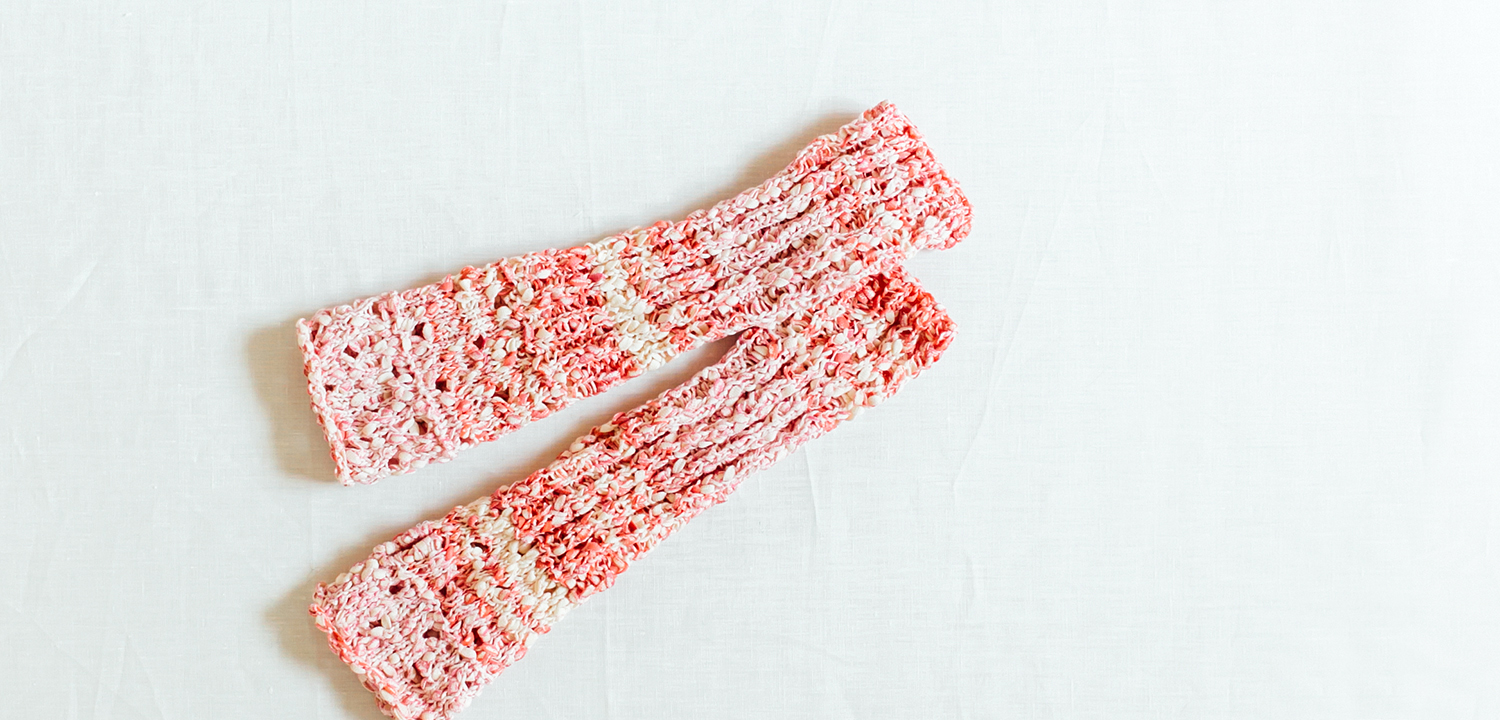 プリントのかすりが特徴のコットン糸でざくざく編むアームカバーです。