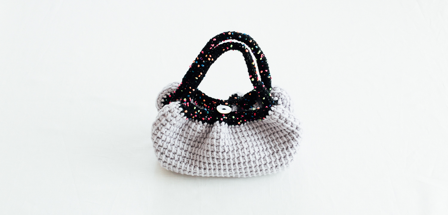 基本のアフガン編みで作った、コロンとした形の可愛らしいバッグです。