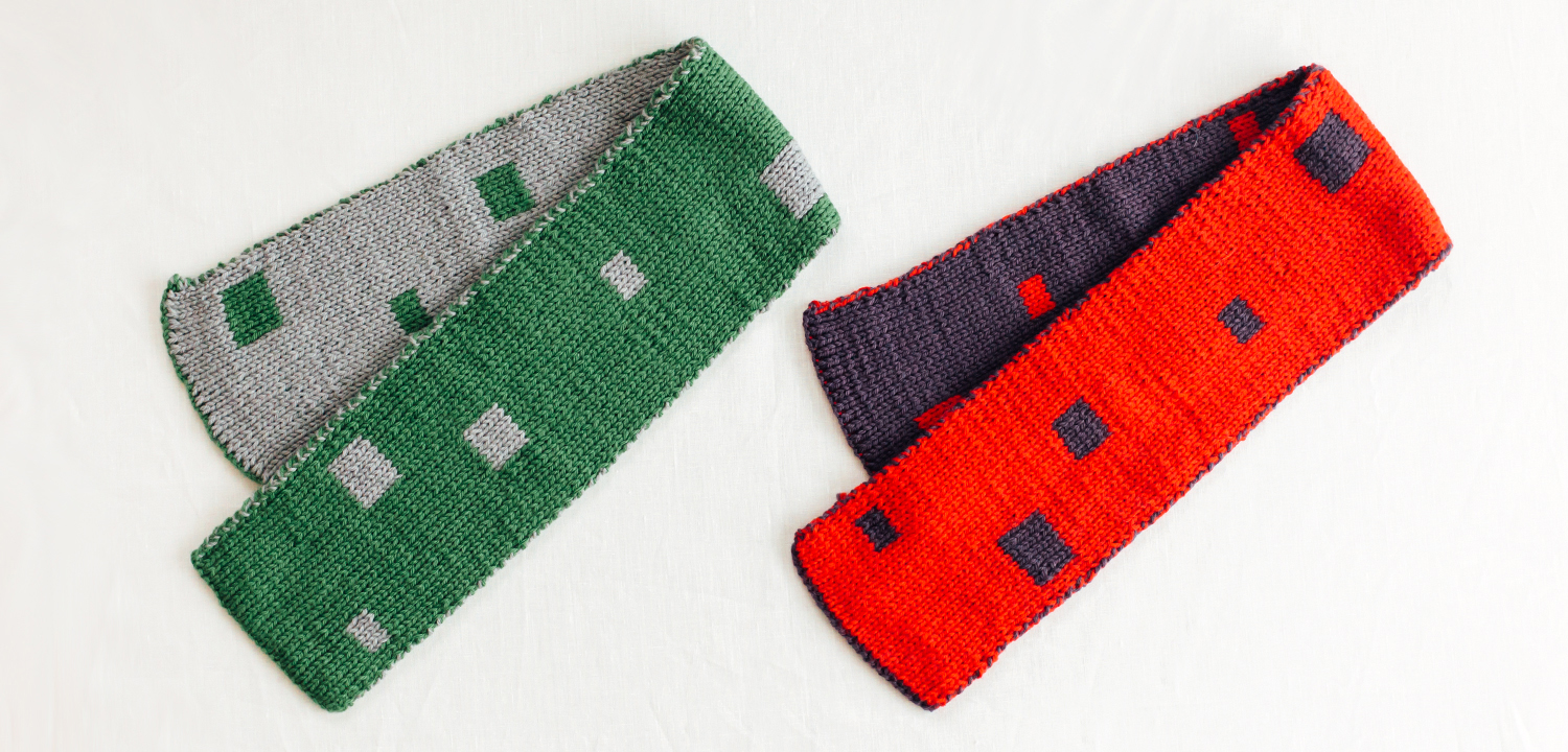 表と裏で色が反対になるリバーシブル編みのマフラーです。少し上級者向けなので、メリヤス編みが編める方向けです。スペクトルモデムからお好きな色をお選びいただけます。